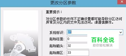 软件将会弹出更改分区参数窗口,根据用户不同需求进行调整分区起止位置和系统标识,完成后按下“确定”按钮,如下图所示: