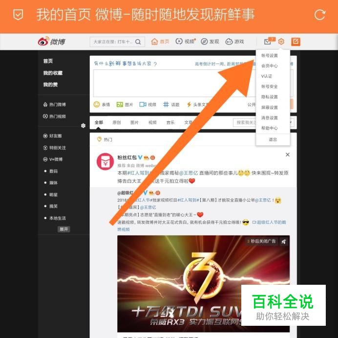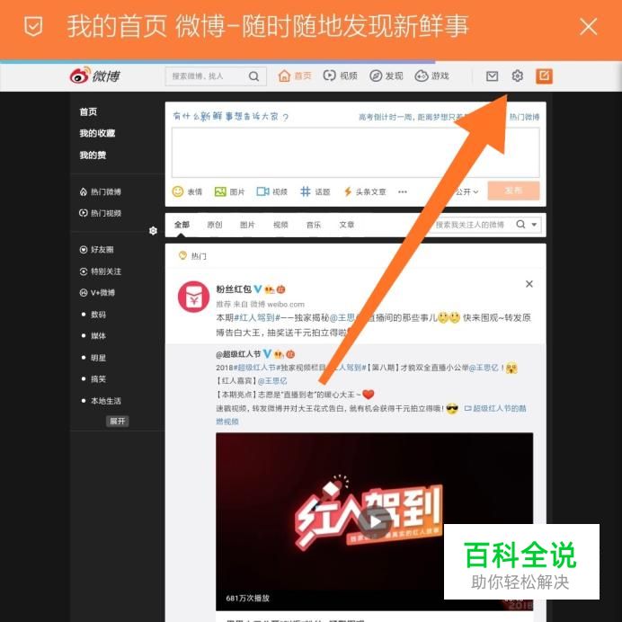 首先进入微博“我的首页”,点击网站右上角的设置图标。
