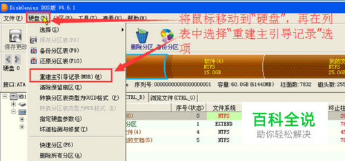再打开的DiskGenius分区工具界面中,将鼠标移动到左上角的“硬盘”在下拉的列表中选择“重建主引导记录(MBR)”。