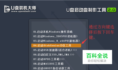 首先将U盘启动盘与电脑连接好。然后重启电脑,在开机画面出现时 按下启动快捷键,在其中选择U盘启动。就进入U盘装机大师主界面,在主界面通过方向键选择“启动DiskGenius分区工具”,然后按下回车键。