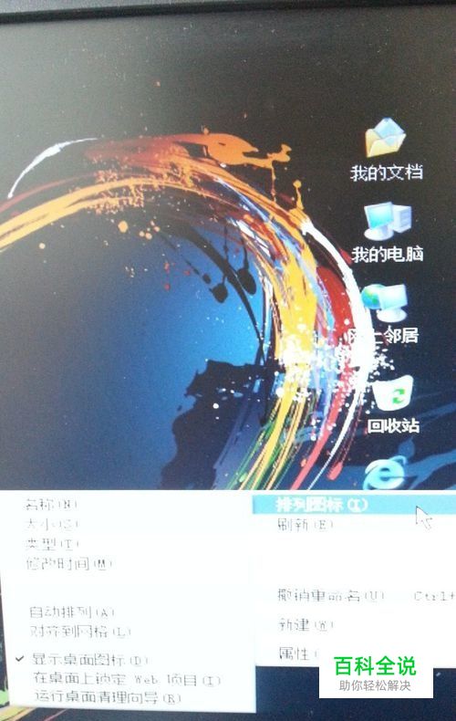 桌面空白处右键一下,光标放在排列图标上面,整个过程只是移动鼠标不要点。