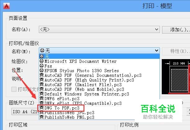 点击打印选项在弹出的对话框内找到打印机/绘图仪选项,点击该选项在其下拉菜单里找到DWG to PDF.pc3选项,如图所示: