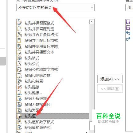 然后点击第一个选择不在功能区中的命令,然后选择下面的粘贴值,直接选择这两个就可以了。然后再点击添加和确定,这样就能在表格中的导航栏里看到这个粘贴值选项了。