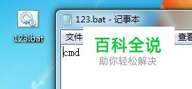 新建一个txt文件,命名为123.txt,然后输入内容CMD,保存为bat格式,即123.bat. 注意:文件名不能为cmd.bat,不然会一直循环。