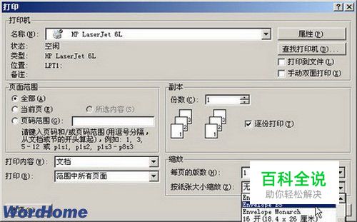 第2步,在打开的“打印”对话框中,单击“缩放”区域的“按纸张大小缩放”下拉三角按钮。在下拉列表中选中合适的纸型,并单击“确定”按钮开始打印。