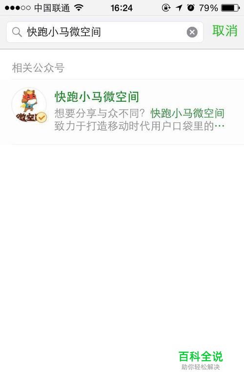 打开微信,点击公众帐号,打开“+”,搜索“快跑小马微空间”