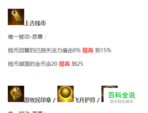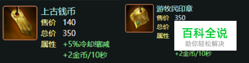 价格:上古钱币为350,升级的游牧者的印章为875,被动带来的金币增长配合捡拾的金币,在前中期完全能够收回成本。 适用英雄:除了传统的保护性辅助,还适用于需要蓝量回复、猥琐发育、前期对线能力弱的英雄。如死歌、发条。