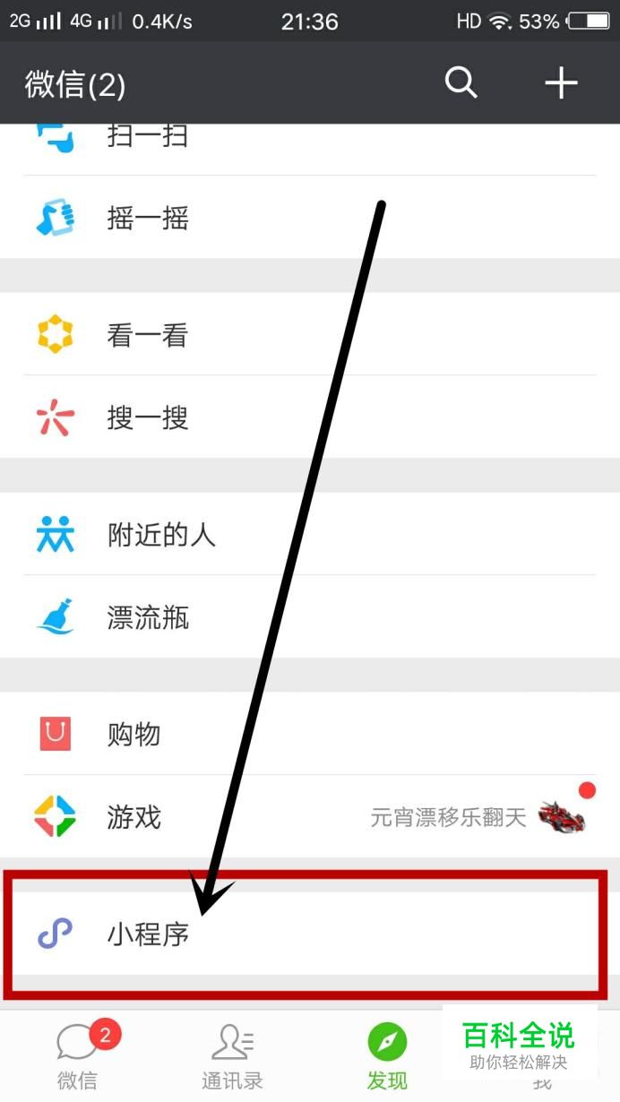 当自己发现财产损失时,要及时保存好与骗子的聊天记录,然后在微信主页面的“发现”界面,找到小程序,如图所示。