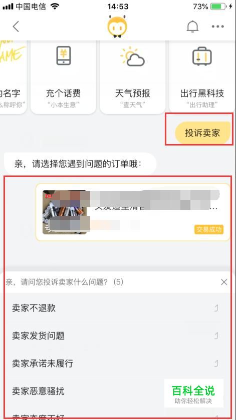 输入投诉卖家关键字并发送,界面会让你选择要投诉的订单,选择好后选择投诉理由即可。