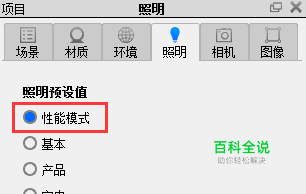 启用性能模式。 按Alt + P(或者点击照明 > 性能模式),在KeyShot中启用性能模式,这将禁用全局照明和阴影,加快渲染速度。