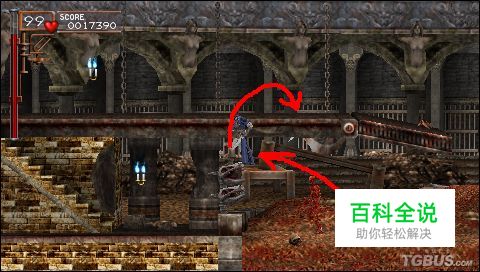 STAGE 7 [HEAR NOW THE REQUIEM OF BLOOD] 桥会塌,后面有大蝙蝠追赶,前方有大蝙蝠堵路.桥陷下去的时候还能站一会的。利用这个高度差能躲过后面过来的蝙蝠,要是遇见那种拿剑的大蝙蝠,就拿鞭子抽吧.或者被伤一点血也行.好过活生剩地摔死……好好利用STAGE 6带过的来的十字架,在这里可以发挥很大的作用。 过桥进门就会来到时计塔了,第二面的鸟人很烦人,快速解决之。第三面会有美杜莎头,不过没有想象中那么密集,还好,继续前进,会碰到巨剑兵.其攻击范围比较广,不要贪鞭.打两下就往回撤,要不来不及的。在巨剑兵的房间往右走,会到下图所示的地方,抽两边的铜像就能取得CD一张(也就是音乐欣赏模式中的其中一条曲目).之后返回上楼梯,继续前进。会到达一个有两个钟摆的地方。门在左边,要跳过那段距离必须要利用钟摆,使用后空翻能跳到钟摆上。进门后就是BOSS战了,破坏下图画红圈处可以得到一碟肉~右上的蜡烛是圣水,取得方法为:先用后空翻跳上平台,之后再用下面蜡烛打出的小刀跃起攻击。在没跳到最高点前就要开始投掷小刀了。 BOSS战 BOSS是被魔力控制而变成夜魔的女主角,在其被蝙蝠包围的时候攻击是完全无效的,必须要等到其攻击结束的时候才能进行攻击,其攻击方式有四种。一是蝙蝠从天上向地面分散冲击,站在空当处就行,二是蝙蝠程扇型分布在其上,前,下三个方向,这时要尽快移动到版边就能躲 过。三是蝙蝠以夜魔为中心,向周围顺时针扩散,同样站在空当处就没事.最后就是用蝙蝠集中冲击主角,只要移动回避就行。这4招说起来好像很容易避开,实际上并不是这样。因为这些空当并不好把握.要有反复打几次的觉悟……