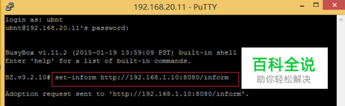 3.采用Putty通过ssh访问UAP1的IP地址配置该AP跨网段3层路由指向到UniFi控制器192.168.1.10上