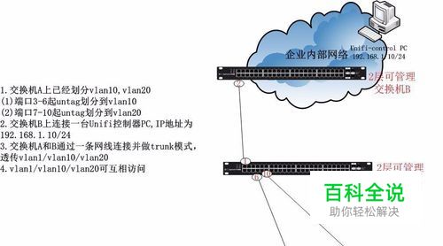 一.网络连接图 二.网络说明1.交换机A上已经划分vlan10,vlan20(1)端口3-6起untag划分到vlan10(2)端口7-10起untag划分到vlan202.交换机B上连接一台Unifi控制器PC,IP地址为192.168.1.10/243.交换机A和B通过一条网线连接并做trunk模式,透传vlan1/vlan10/vlan204.vlan1/vlan10/vlan20可互相访问5.笔记本电脑可接到交换机A端口3-6,获得vlan10对应的DHCP-IP192.168.10.X/246.笔记本电脑可接到ES24上端口7-10,获得vlan20对应的DHCP-IP192.168.20.X.24