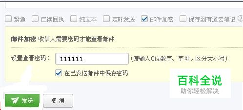 接着弹出设置查看密码输入框,在输入框中输入查看该邮件的密码,比如:111111,然后再点击下面的“发送”按钮。(如下图)