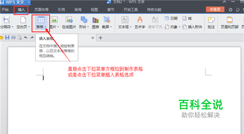 首先新建一个wps文档,开始制作表格,点击上面【表格】,下拉菜单中,可以直接拉出一个表格。