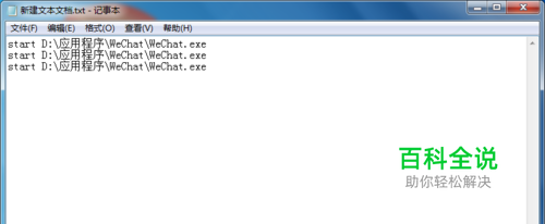然后打开这个文本文档输入start (粘贴复制的位置)\WeChat.exe: start D:\应用程序\WeChat\WeChat.exe start D:\应用程序\WeChat\WeChat.exe start D:\应用程序\WeChat\WeChat.exe 需要同时打开几个就输入几行。