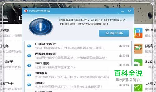 在弹出窗口上面,我们点击“全面诊断”,这个时候系统会给我们的网络进行诊断,诊断时候就可以进行修复,之后你就可以查看是否修复了。