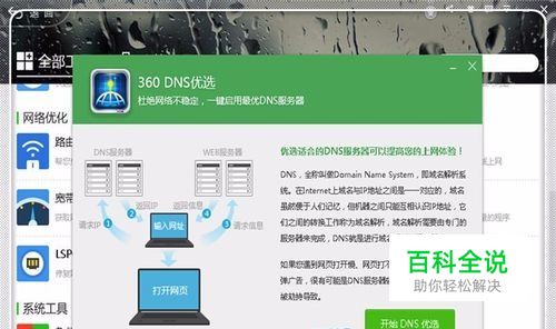 进入界面之后,我们首先找到DNS优选,点击其打开,会弹出一个窗口,我们在点击“开始DNS优选”进行网络选择。