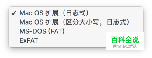 Mac OS 扩展(日志式):是苹果独有的一种硬盘格式,操作系统会将对文件所做更改的日志存储在宗卷中,当文件被破坏时,该日志有助于操作系统将磁盘恢复到可用状态。 Mac OS 扩展(区分大小写,日志式):在上一格式基础上,增加了区分文件夹名称大小写的功能。例如,“Apple”和“APPLE”是两个不同的文件夹。 MS-DOS (FAT):可以同时用于 Windows 系统和 Mac 系统,U盘 / 移动硬盘容量不能超过 32G ,且不支持4G以上单个文件存储。 ExFAT:可以同时用于 Windows 系统和 Mac 系统,U盘 / 移动硬盘容量可以超过 32G ,且支持4G以上单个文件存储。