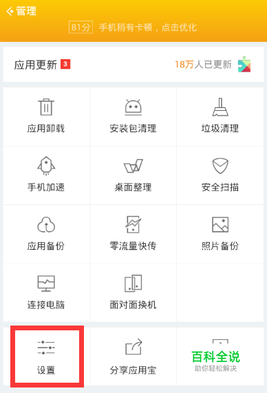 打开应用宝工具箱之后,拖动页面到最下方,可以找到【设置】按钮