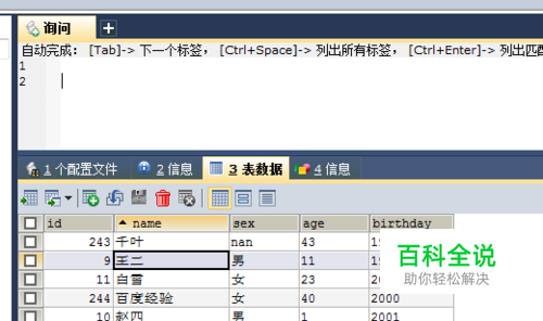 表 CREATE TABLE `student` ( `id` int(50) NOT NULL AUTO_INCREMENT, `name` varchar(50) DEFAULT NULL, `sex` varchar(48) DEFAULT NULL, `age` varchar(50) DEFAULT NULL, `birthday` varchar(50) DEFAULT NULL, PRIMARY KEY (`id`)) ENGINE=InnoDB AUTO_INCREMENT=244 DEFAULT CHARSET=utf8