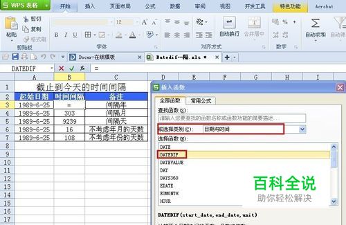 “插入函数”窗口选择类别和Datedif函数。如图:
