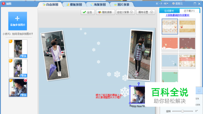 可以在右边选择你喜欢的素材背景。 (嗯,于是我选了这个雪花飘飘的背景~ 呃呃。。我在这声明一点,我选择这背景不仅仅是因为好看,还有需要的好吧!)