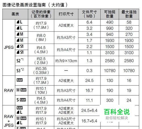 画质选择 尺寸不一定是越大越好,要考虑适用场合和储存卡的容量。 S2适合于在数码相框上播放图像。 S3适合于将图像作为电子邮件发送或在网站上使用。 文件尺寸、可拍摄数量和连拍期间的最大连拍数目基于使用4GB存储卡时的佳 能测试标准(3:2长宽比、ISO100和标准照片风格)。根据拍摄主体、存储卡 品牌、长宽比、ISO感光度、照片风格、自定义功能和其他设置的不同,这些 数值将会有所不同。 如果选择RAW和JPEG,将以所选图像记录画质以两种文件类型同时在存储上记录相同图像。将在同一文件夹中以相同文件编号保存两幅图像(JPEG的文件扩展名为*.JPG,RAW的文件扩展名为*.CR2)。 关于RAW RAW图像是由图像感应器输出的原始数据并被转换为数字数据。这种格式细节更丰富,后期可随意调整白平衡、清晰度、色彩饱和度、亮度、对比度等,对片质的影响很小。后期调整软件可以选择随机附带的DPP软件。 RAW图像能用[RAW图像处理]菜单处理,并作为JPEG图像保存。虽然RAW 图像本身不发生变化,但可以根据不同的条件处理RAW图像,从该RAW图像创建任意数目的JPEG图像。 对于所有RAW图像,可以使用随机提供的软件进行各种调整,然后生成采用了这些调整的JPEG、TIFF等图像。