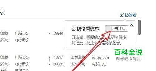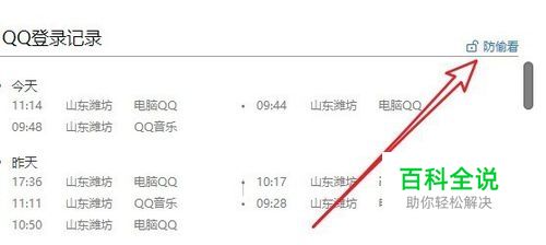 如果不想让其它人看到我们的QQ登录记录,我们可以点击右上角的“防偷看”快捷链接。