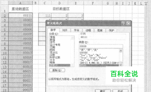 第一步,选中A2:A22单元格区域按<Ctrl+ 1>组合键.打开“单元格格式”对话框,选择:数字”选项卡,在“分类”列表框中单击’‘自定义”选项,在右侧的“类型”文本框中填入“00000”,其中0的个数与当前源数据区域中的最大数值的位数相同,然后单击“确定”按钮关闭对话框,即可得到自定义数字格式后的显示结果,如图