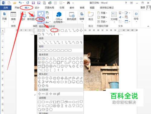 进入【插入】-【形状】,在下拉菜单中选择矩形,插入在文档中。