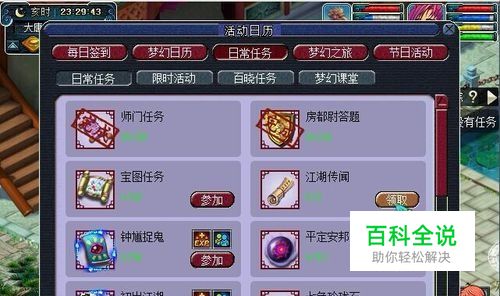 在日常任务中领取: 很多新手朋友还有不知道江湖传闻这个任务哪边领取的,其实没有特定的NPC,在日常活动的列表里就可以找到的,日常活动在右上角,一个小日历的图表当中哦。