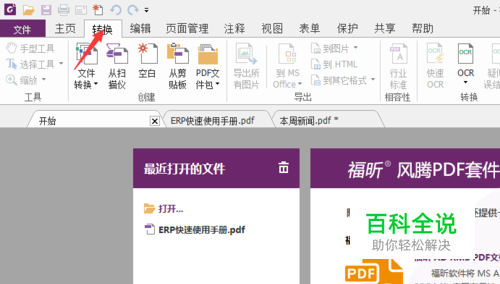 PDF格式的文档很多,一些方便的功能可以直接在PDF编辑器中实现。怎样把电脑中的文件转换成PDF格式呢? 首先打开福昕风腾PDF套件,在上面工具栏中点击“转换”栏。