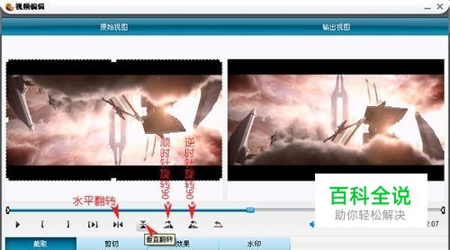 旋转功能按钮在进度条的下方有一排的黑色小按钮,鼠标移至其上方,按钮会主动浮现相应的功能注释的。分别有水平旋转、垂直旋转、逆时针/顺时针旋转90°四个方法。点击相应的功能按钮可以在右边上方的窗口预览相应的效果。