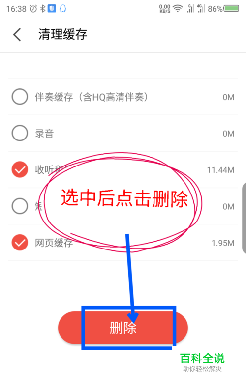 勾选上需要删除清理的缓存文件,如果缓存大小是零,是选不中的而且没有东西可以删除。选择后点击最下面的删除选项。
