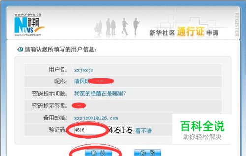 点击下一步,进入确认用户信息页面,核对所填信息无误后,填上系统提示的验证码后,点击确定便会进入下一个注册成功页面,表示已经注册成功,在核对信息时如发现有需要修改的地方,可以点击修改链接,进行修改后再确认进行注册。