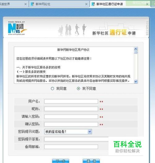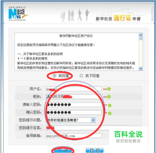 分别在用户名、昵称、请输入密码、确认密码、密码提示问题、密码提示答案、备用邮箱对应的空白区域内填入注册信息,社区用户协议选择我同意选项。