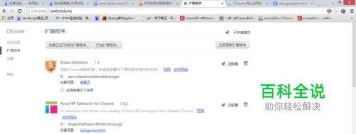 点击之后,就可以进入浏览器 的扩展插件页面,在这儿会显示你的浏览器已经安装的插件。