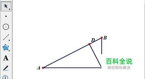 用“线段直尺工具”作线段AC,用“选择工具”选中点C及线段AC,选择“构造”——“垂线”,绘制过点C的垂线,在线上取一点B,构造线段BC并隐藏垂线。连接线段AB,则得到三角形ABC。用“选择工具”选中点C、线段AB,选择“构造”——“垂线”,绘制过点C的垂线,并标记垂足为点D;构造线段CD并隐藏垂线。