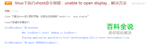 linux 下通过xhost进入图形界面,经常会出现报错“unable to open display” linux下的操作步骤如下: [root@localhost ~]# vncserver New 'localhost:1 (root)' desktop is localhost:1 Starting applications specified in /root/.vnc/xstartupLog file is /root/.vnc/localhost:1.log [root@localhost ~]# export DISPLAY=localhost:1 [root@localhost ~]# xhost + access control disabled, clients can connect from any host 在设置xhost时,出现unable to open display 的问题一般都能用上述方法搞定