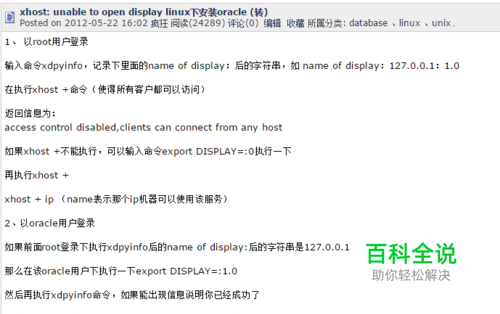 以root用户登录 输入命令xdpyinfo,记录下里面的name of display:后的字符串,如 name of display:127.0.0.1:1.0 在执行xhost +命令(使得所有客户都可以访问) 返回信息为: access control disabled,clients can connect from any host 如果xhost +不能执行,可以输入命令export DISPLAY=:0执行一下 再执行xhost + xhost + ip (name表示那个ip机器可以使用该服务) 以oracle用户登录 如果前面root登录下执行xdpyinfo后的name of display:后的字符串是127.0.0.1:1.0 那么在该oracle用户下执行一下export DISPLAY=:1.0 然后再执行xdpyinfo命令,如果能出现信息说明你已经成功了 这样估计就可以解决linux下安装oracle出现的xhost问题
