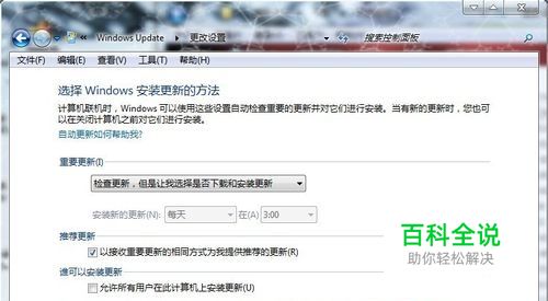 第三步: (Windows7)中则要在打开的”Windows update“菜单中再打开”更改设置“即可进行设置。