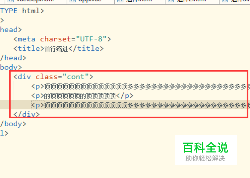 设置样式。在<title>标签后面新建一个<style>,在这个<style>设置cont类的宽为400px,然后设置p标签的首行缩进为两个字符。如图: 代码: <style> .cont{ width:400px; } .cont p{ text-indent: 2em; } </style>