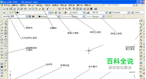 1、如下图是CAD 2008软件经常的选择有菜单栏、工具栏、绘图和修改工具栏、坐标系、布局标签、命令窗口等等。