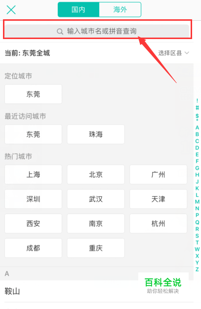 第四步,因为定位的地方过于多,你在列表上找不到时,可以直接在页面上输入你要去的城市名,进行搜索查询。如图所示: