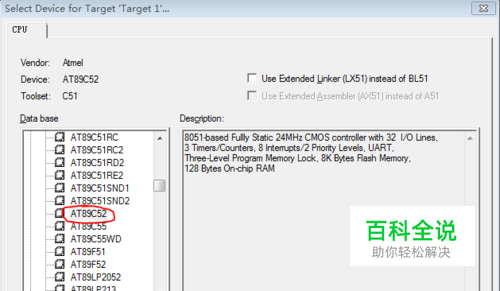 输入工程名后会出现如下图所示的芯片选择对话框,选择你开发板上的型号即可(相信要看这张帖子的读者一定是在学51单片机,此时只需选择 Atmel->AT89c52即可。如下第二张图所示)