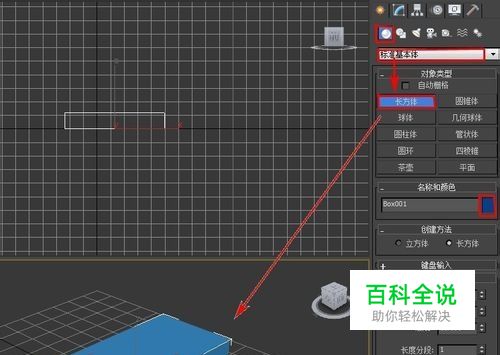 在右边命令面板选择“几何体”,在下拉框里选择“标准基本体”,选中“长方体”,颜色设置为“兰色”,在透视图里创建一个基本长方体。