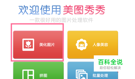 首先我们先下载一个图片处理软件,这里以美图秀秀为例,下载完毕后点击打开软件,在软件的首页点击【美化图片】。