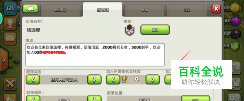 在部落编辑界面要对自己的部落做一定的介绍,如果只想让中国的玩家加入,在位置那里选择China,还有战争频率、部落类型等都要设置。还有设置加入的奖杯数,太高一些低本可能加不了,太低收到的有都是一些新手速本等等,所以需要设置合适的杯数,根据个人部落发展情况来定。