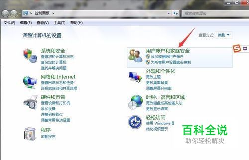 左键点击控制面板,看到图示界面,找到“用户账户和家庭安全”并左击
